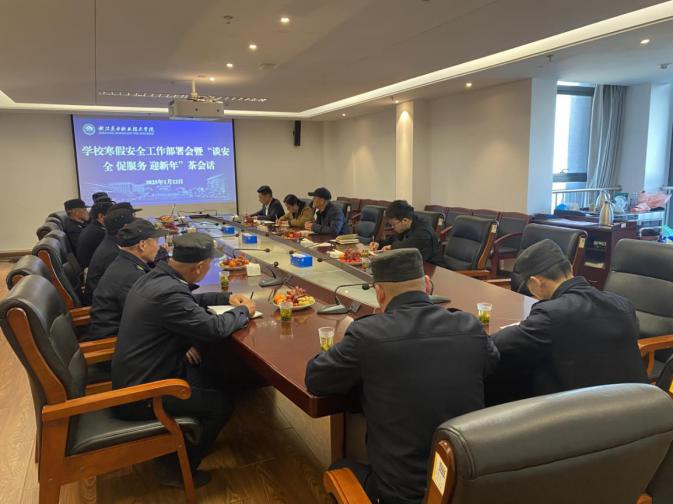 为进一步完善除险保安机制,提高校园安全管理水平,确保学校寒假期间安全管理形势持续稳定向好,1月12日,学校保卫部组织华侨物业开展寒假安全工作部署会暨“话平安 促服务 迎新年”茶话会,会议由保卫部单继伟主持。
