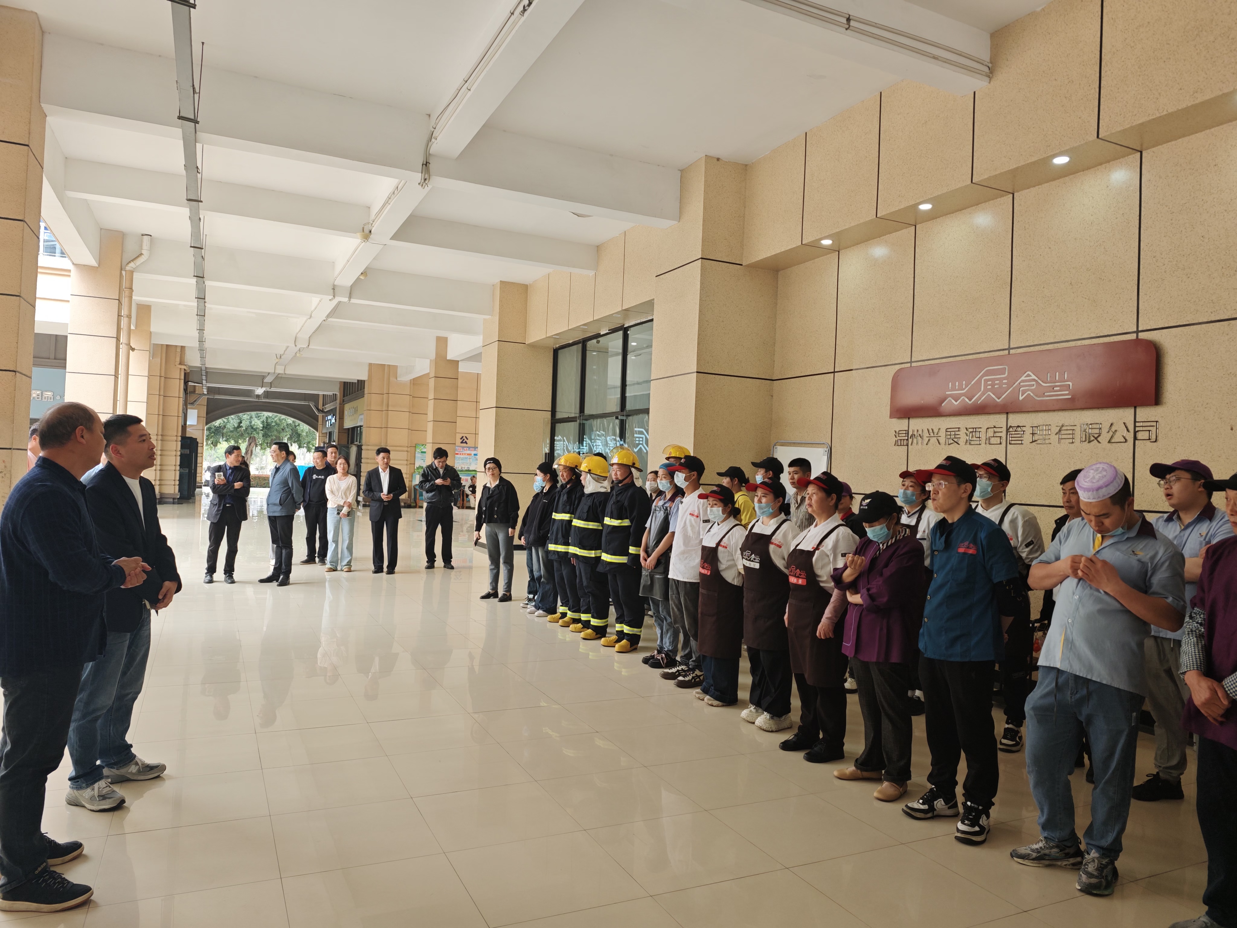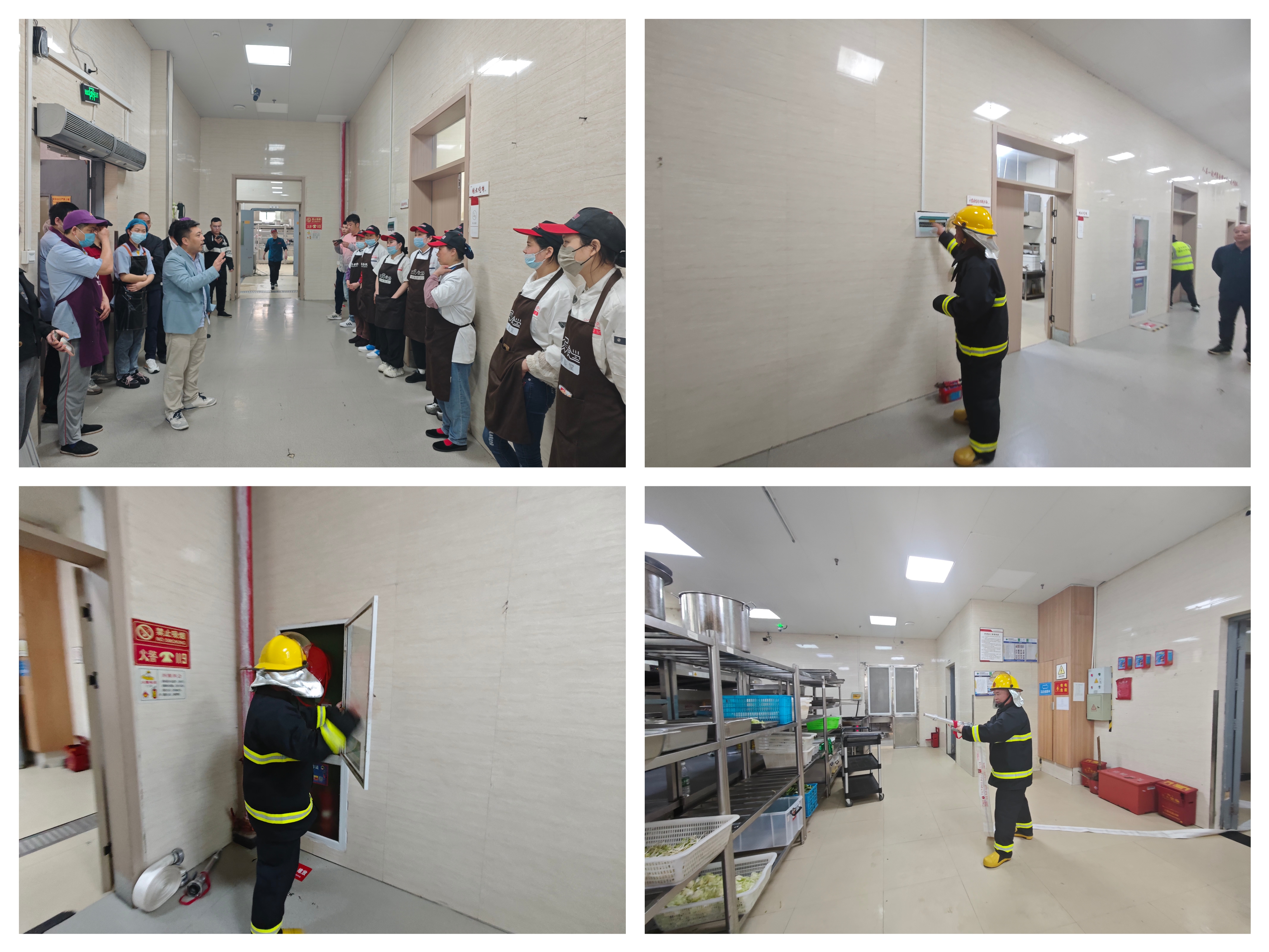 演练指挥长项忠宣布演练开始,食堂员工在疏散组的指引下,捂住口鼻按预定疏散路线有序进行疏散。随后保卫组赶到现场,迅速展开灭火救援行动,整个演练各环节节奏紧凑,秩序井然,“火情”被成功“扑灭”。