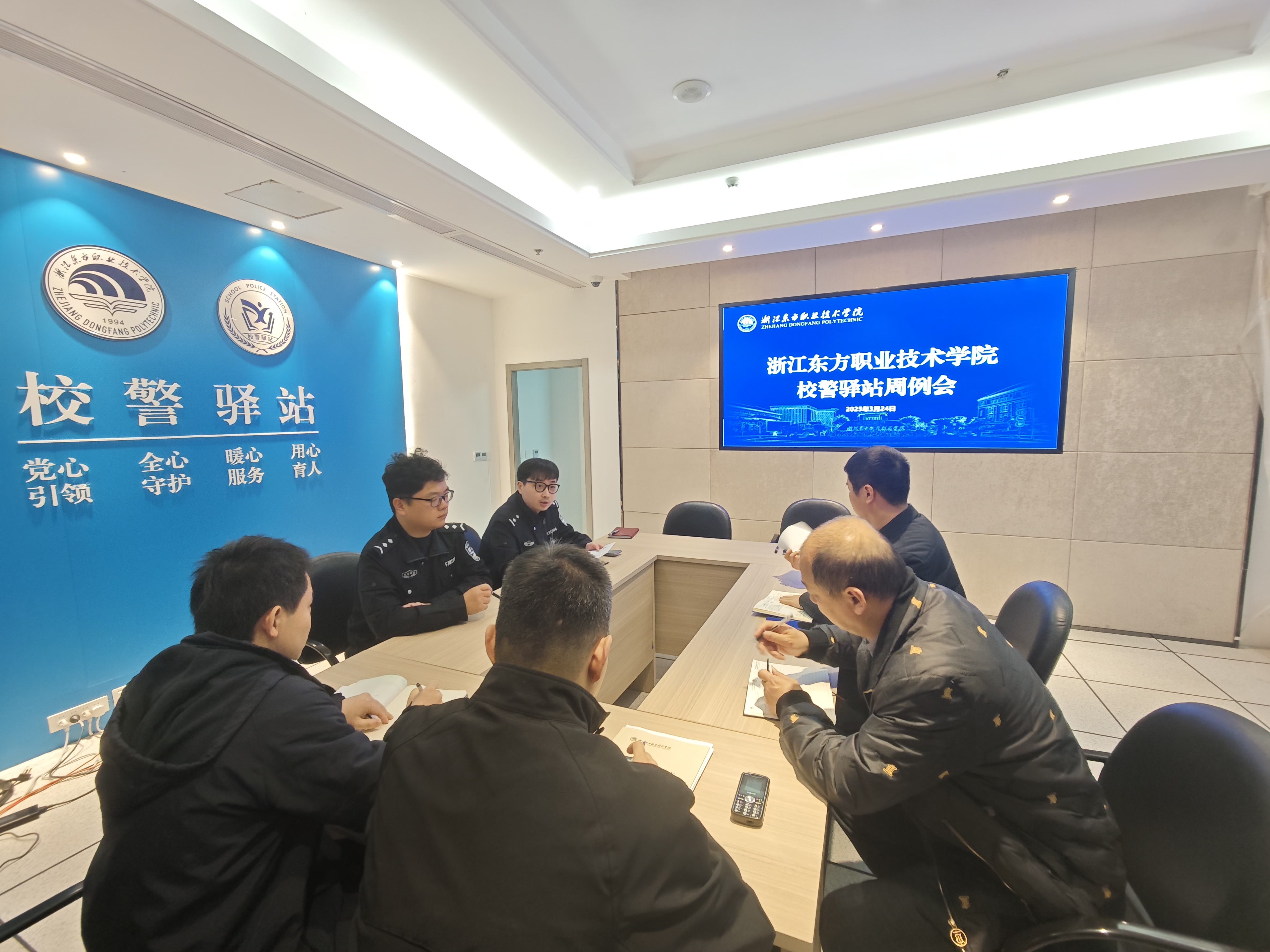 为进一步深化平安校园建设,强化校警协同联动机制,充分发挥校警驿站联络站作用,3月28日上午,学校保卫部联合组宣统部、学工部、后勤处及属地金海派出所,在行政楼一楼校警驿站召开校园安全管理专题例会,共商安全治理举措,共筑校园安全防线。