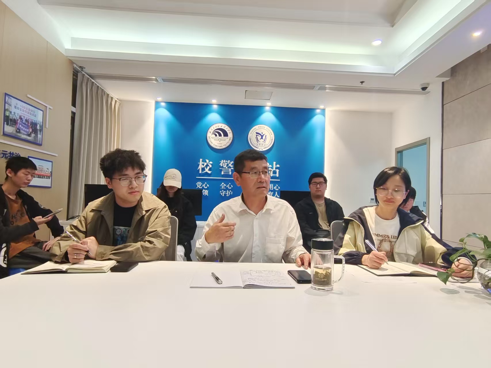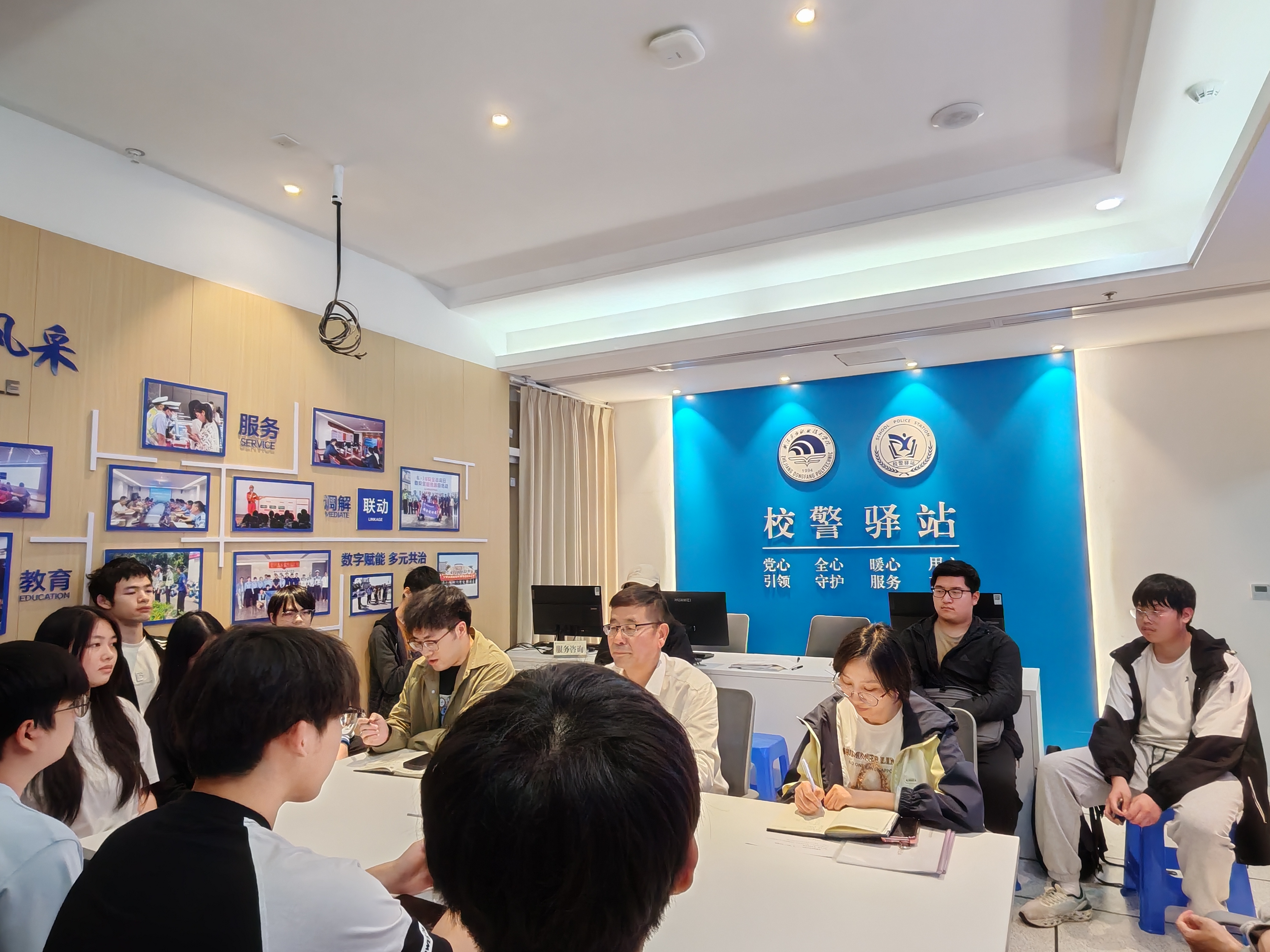 为进一步加强校园安全管理,深化校警驿站建设,发挥安全服务中心作用,4月22日中午,学校召开安全服务中心会议,校领导、校警驿站教育专员贺文华,保卫部李玲霞、项金榜以及安全服务中心全体学生干部参加本次会议。