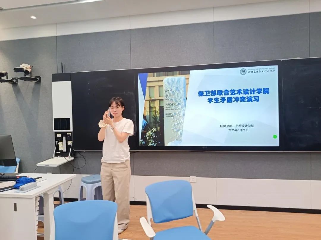 为进一步加强校园安全管理,发挥校警驿站调解站作用,提升师生矛盾化解能力,5月21日,保卫部联合艺术设计学院组织开展学生矛盾突发事件应急演练。校党委委员、副校长项忠,安全保卫部副部长单继伟,艺术设计学院党总支副书记李海峰等相关人员参加本次演练。