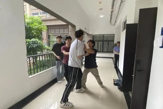 在情景模拟演练环节,主要模拟教室内学生学习矛盾突然爆发激烈争吵,两名学生因学术观点分歧各执己见,言辞逐渐升级为肢体冲突。现场气氛一度剑拔弩张,在场学生见状立即启动应急预案:一方面迅速通过校园报警电话86557110向保卫部发出求助信号,另一方面同步将情况上报至学院辅导员吴展老师,实现"双线联动"的快速响应机制。